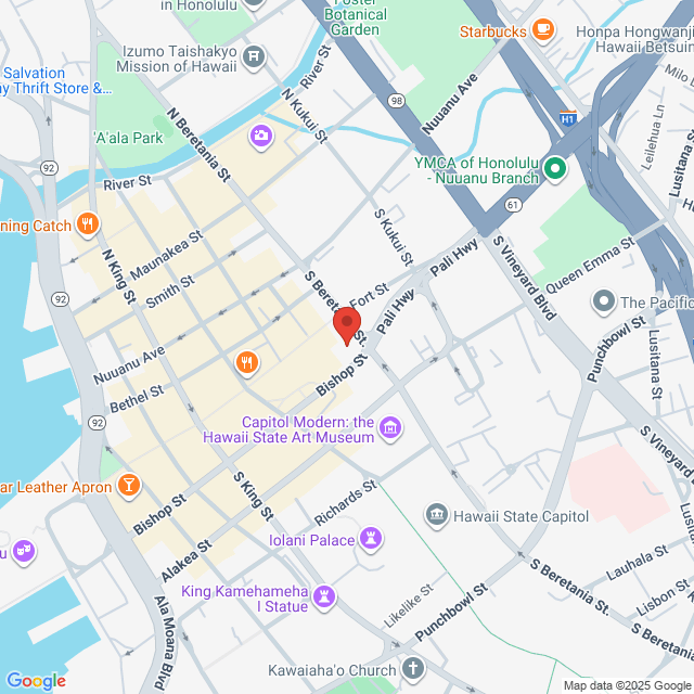 Driving Westbound take the H1 West and exit at 22 for Vineyard Blvd. Turn left onto Pali Hwy. and stay in the middle lane. At the first traffic light at the intersection of S Beretania St. and Bishop St., the building will be on your right.
